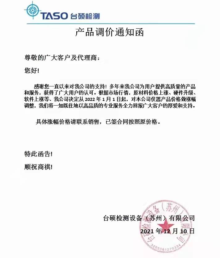 目前,根据市场行情,原材料价格上涨、硬件升级、软件上涨等多方因素的产生,我公司决定从2022年1月1日起,对本公司仪器产品价格做涨幅调整;台硕仪器坚持多年来为用户提供高质量的产品和服务,后期我们将一如既往地以高品质的专业服务,全力回报广大客户的支持与厚爱!具体详情欢迎致电销售人员咨询,针对已签订合同的用户,依旧按照原价格服务!
