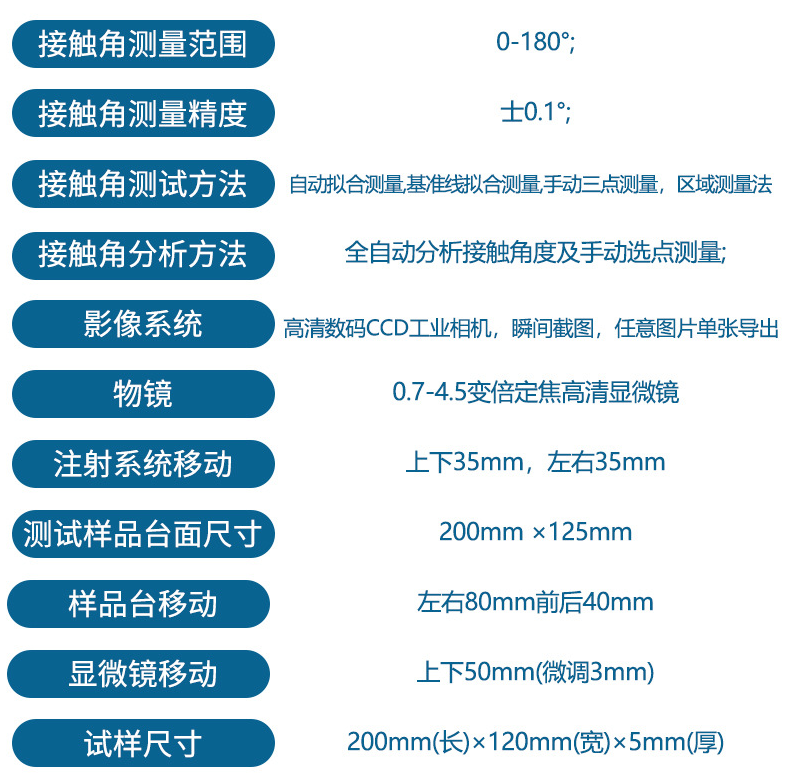 水滴角的定义为在固、液、气三相交界面处,气-液相界面与固-液相界面之间的夹角,水滴角是显示固体表面湿度的尺度,利用大部分固着物液滴进行测定,低接触角表示湿度高(亲水性)表面易粘贴。高接触水滴角表示表面显示疏水性,表面有机污染较重或表面附着力差。与平坦的固体表面像接触的液体的接触角,通过液体-固体-气体接合点中水珠曲线的终点和固体表面的接触点测定出来分析表面洁净度,接触角是显示固体表面湿度的尺度,利用大部分固着物液滴进行测定,低接触角表示湿度高(亲水性、疏水性),表面能量低。