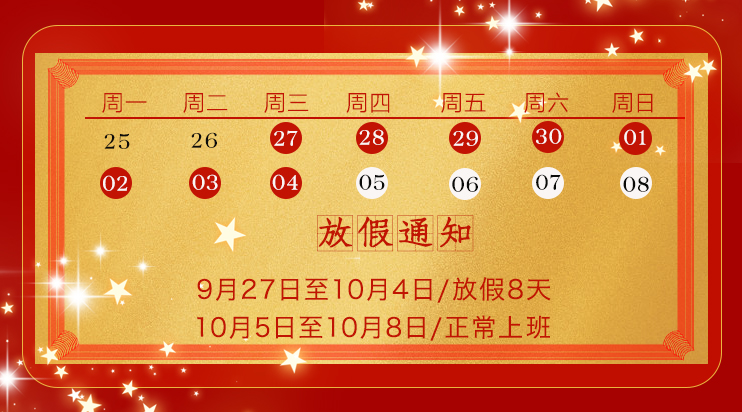 在这段时间里,公司将暂停正常运营,部分紧急事务将由值班人员负责处理。 希望大家能够合理安排好自己的假期时间,尽情享受这个难得的长假。无论是回家探亲还是外出旅游,都要注意安全,遵守交通规则,确保自身和家人的安全。同时,也希望大家能够放松心情,调整状态,在假期中恢复精力,以更饱满的热情投入到工作中。 在此期间,如果遇到任何紧急情况或有需要协助的事项,请及时与值班人员联系。公司将保持通讯畅通,确保能够及时响应和处理各类紧急情况。 最后,感谢大家一直以来的辛勤工作和付出,正是有了大家的支持与努力,台硕才能不断发展壮大。希望大家在假期中能够得到充分的休息和放松,回来后以更高的热情投入到工作中,共同创造更加美好的明天。 祝大家中秋国庆双节快乐!愿祖国繁荣昌盛,人民幸福安康!