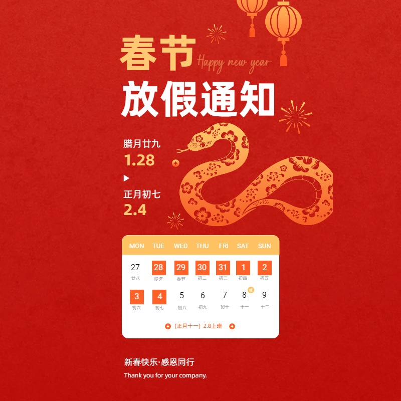上班时间:2025年2月5日(农历正月初八)正式恢复工作,我们将以更加饱满的热情和崭新的面貌迎接新的一年。